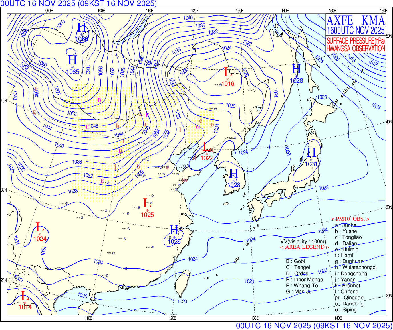 노란색은 사막지역, 적색은 황사가 관측된 지점을 표시합니다.